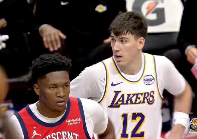 次节回来,霍金斯和贝互相助攻命中三分,鹈鹕将分差缩小至2分。里夫斯突破空中与奎因对抗后出手造犯规,鹈鹕主帅忍无可忍,满面怒容选择挑战最终成功改判,今天裁判确实抢戏。东契奇弧顶迎着防守三分命中,投进本场首个运动战进球,接着保护篮板后送出超远四分卫精准长传,拉拉维亚接球一打零轻松扣篮得手,湖人重新领先到7分。琼斯和阿尔瓦拉多连续三分打铁,东契奇持球反击,追身三分干拔再中,次节已砍下13分。东契奇突破摆脱包夹,助攻艾顿完成空接双手扣篮,半场战罢,湖人65-52领先鹈鹕13分。