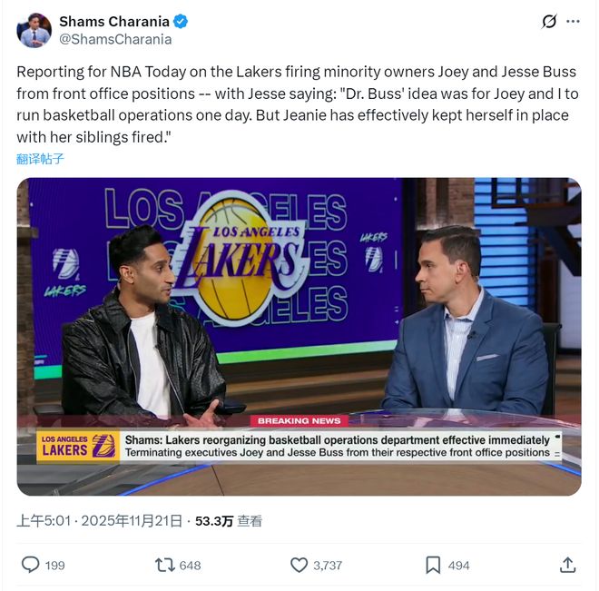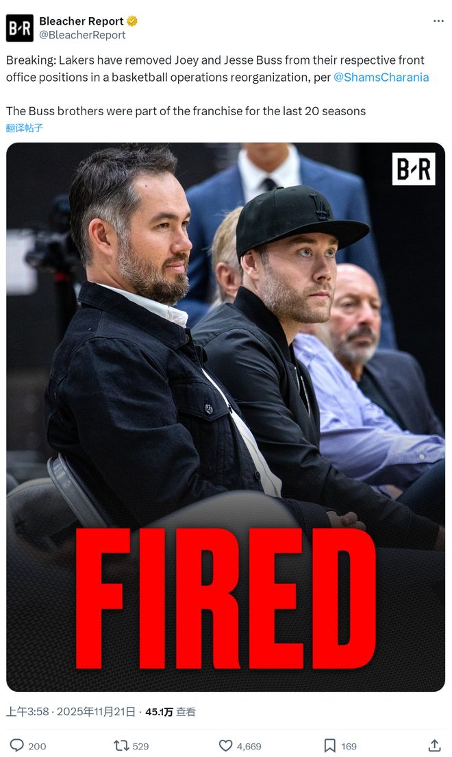 北京时间11月21日,据NBA名记Shams报道,湖人管理层发生重大变动,立即解除两个小老板乔伊-巴斯和杰西-巴斯在管理层的职务。尽管将大部分球队股份卖给马克-沃尔特,但巴斯家族仍然保留了15%的股份,这哥俩依然是湖人小股东。