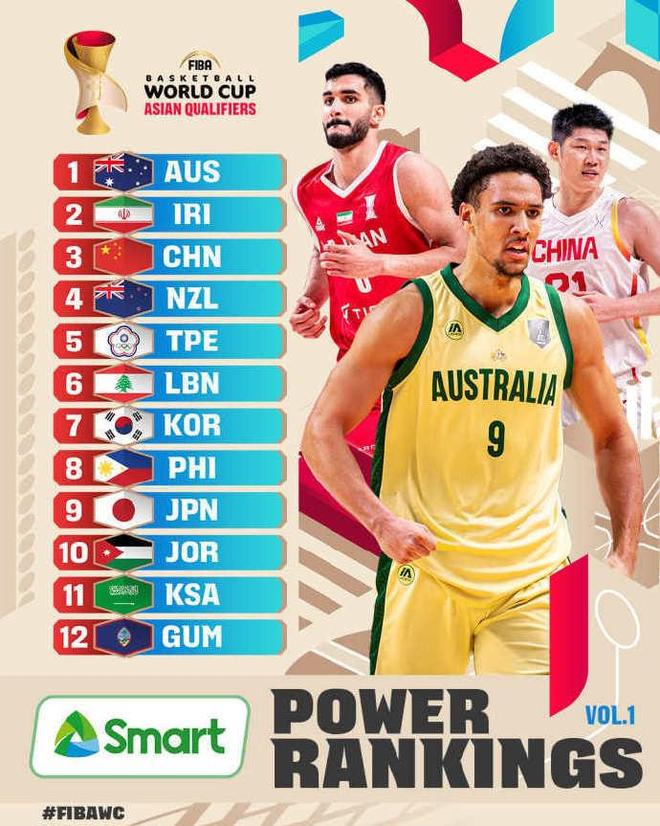 男篮世预赛亚洲区实力榜:中国第三,澳大利亚第一,韩国第七