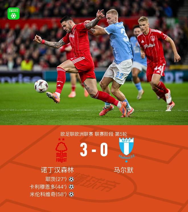 诺丁汉森林3-0马尔默,耶茨、卡利穆恩多、米伦科维奇建功