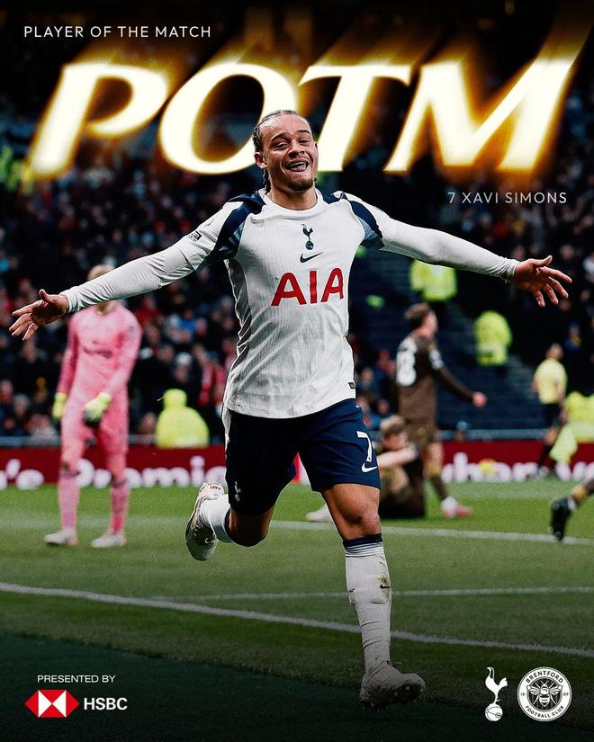 1射1传,哈维-西蒙斯当选热刺2-0布伦特福德一役队内最佳球员